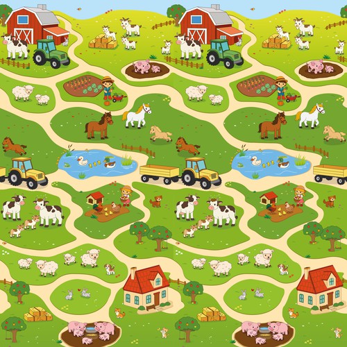 We are looking for a seamless, repeating farm-themed pattern for a baby play mat made of XPE foam 150*180cm - 180*200cm.